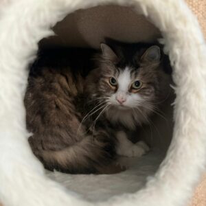 Bij ons is Nori een bang katje, maar ze zal eerder weg lopen dan boos worden. We zoeken een rustige thuis voor haar waar ze de tijd krijgt om zich aan te passen.
