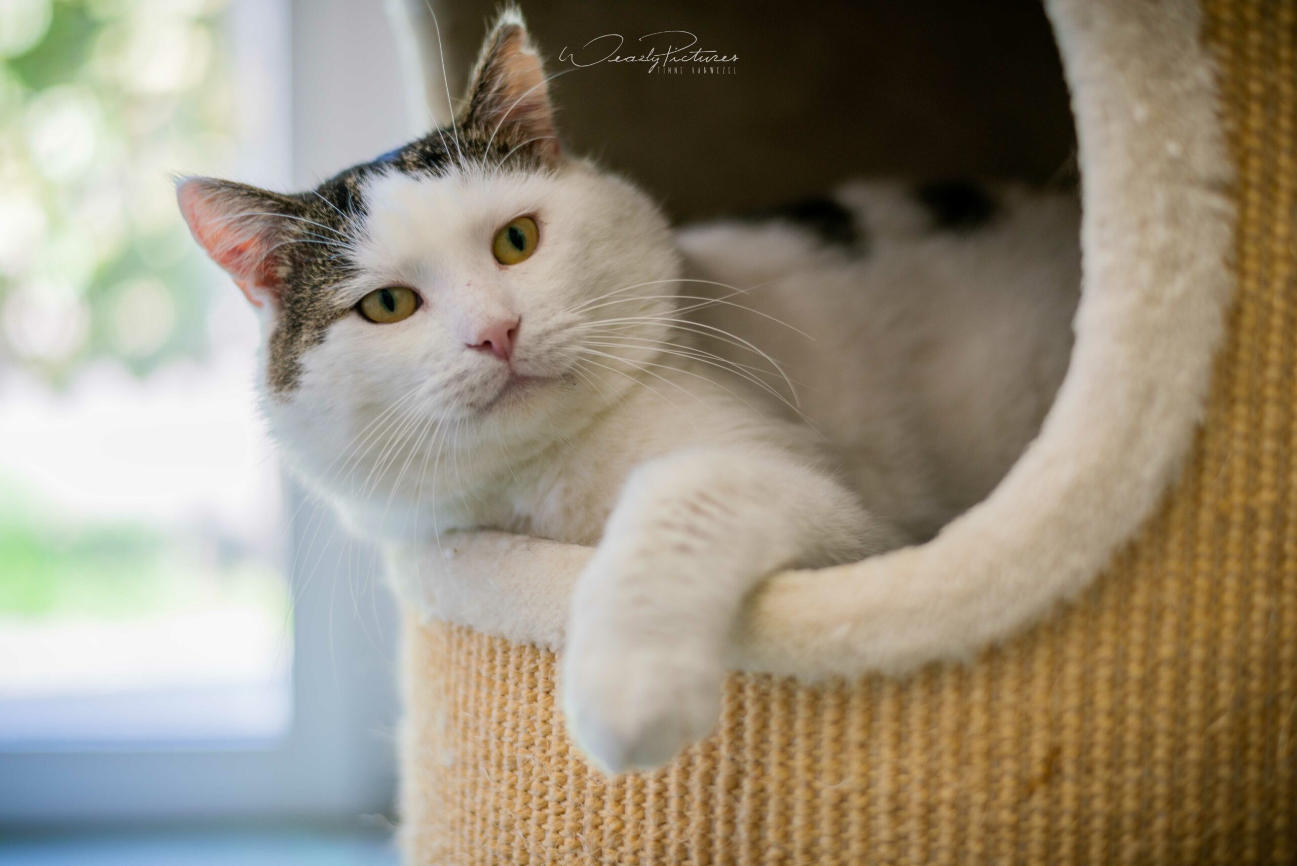 Bij ons is Snowy vriendelijk en zelfzeker naar mensen toe, maar hij weet wel goed wat hij wil. Oppakken heeft hij bijvoorbeeld niet graag. Hij reageert niet goed op de andere katjes, dus we zoeken een thuis waar hij enige viervoeter is.